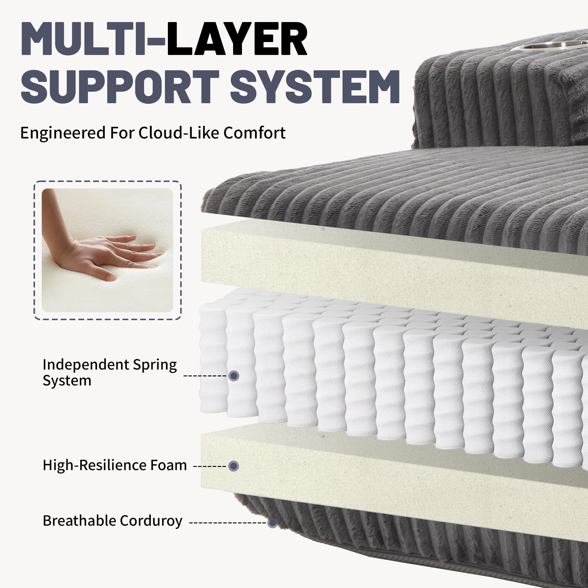 Built-In Spring Cushion Support – No Sagging Over Time:Unlike traditional foam-only sofas, our seat cushion is reinforced with high-resilience spring packs to ensure long-lasting support and bounce. It evenly distributes pressure, resists sagging, and offers comfortable seating for extended use.