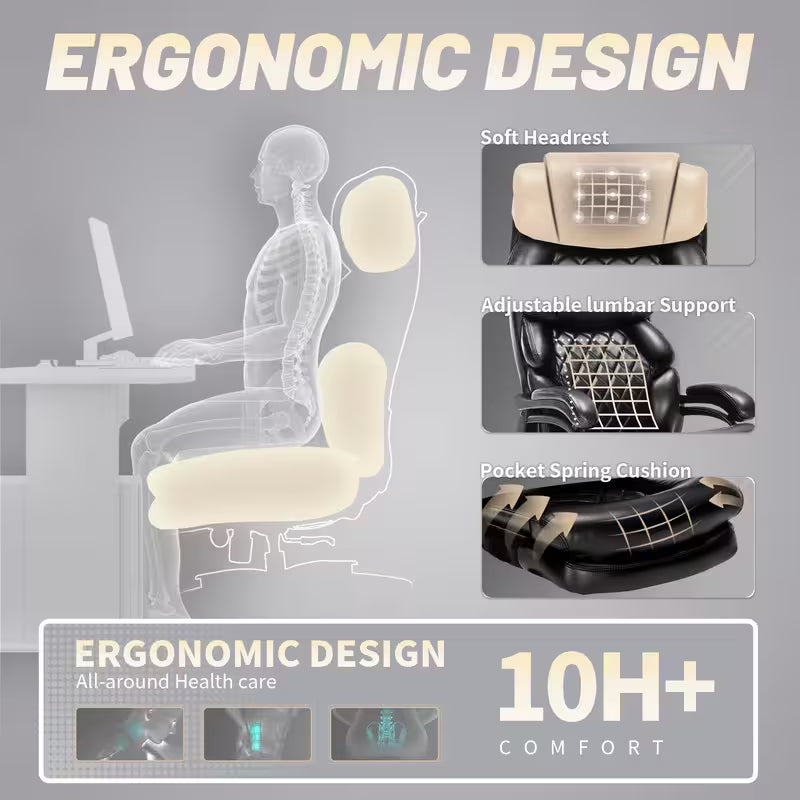 Ergonomic Full-Body Support:Designed as a high back executive chair with lumbar support, Ergonomic Armrests, and a padded headrest, it provides comprehensive support for long hours of office work or gaming.